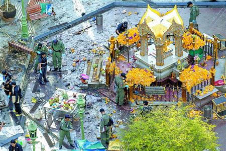 8月18日,泰国首都曼谷市中心的四面佛周围一片狼藉。由泰国警方拆弹部队和现场勘察传出的最新消息是,这次爆炸使用的炸弹为成品C-4炸药,填药量在1.4千克至2.5千克之间,非自制炸弹,系由境外带入泰国。新华社/路透