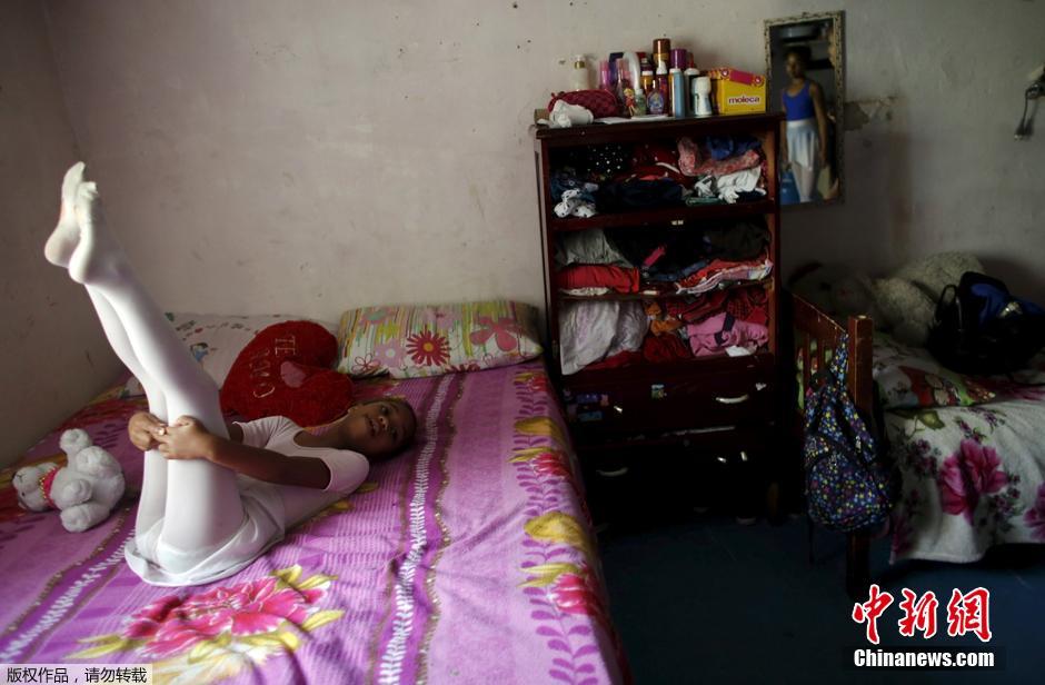 当地时间2015年8月12日,巴西圣保罗,7岁的Thalita Jesus躺在床上,她穿好芭蕾舞服准备去学校上课。