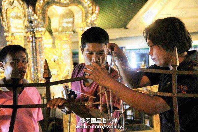 曼谷爆炸致四面佛受损 泰国工人连夜修补(组图)