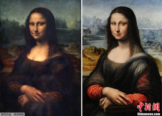 近日,西班牙马德里普拉多博物馆展出了一幅著名画家达芬奇的传世名作《蒙娜丽莎》的同时期复制品。据悉,该作品是达芬奇一名学生的临摹作,将于2012年3月29日开始在法国卢浮宫与原作一同展出。图为达芬奇原作(左)与临摹作品(右)的拼合图片。