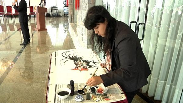铺平宣纸,拿起毛笔,秘鲁天主教大学孔子学院学生白玲镇静自若地在众人面前画了一幅“大公鸡”水墨画。尽管不曾有留学中国的经历,但白玲告诉新华社记者,她从小就喜欢画画,3年前到孔院学习中文时爱上了中国画,她要去中国学画画。这位有些腼腆的女孩儿一说起中国画就收不住话题了,她说:“中国画很美,很独特,也很有韵味,我期盼到中国学习体验水墨绘画技巧。”