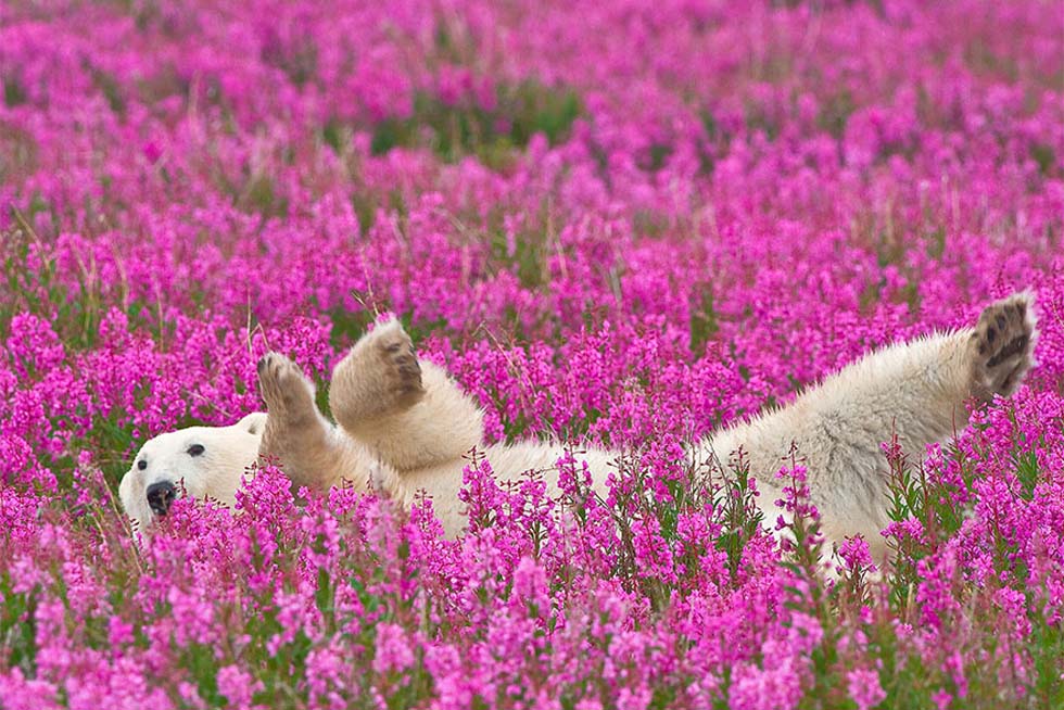 加拿大北极熊在夏日花丛中嬉戏 憨态可掬(高清组图)