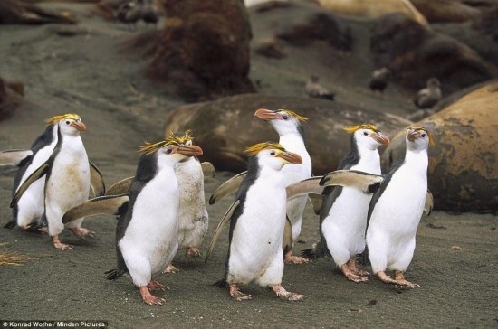 这群皇家企鹅摇摇晃晃地走在沙滩上,样子十分呆萌。
