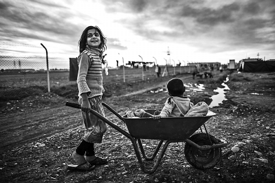 两名儿童在伊拉克库尔德自治区首府埃尔比勒市郊区的一座难民营玩耍。据新华社