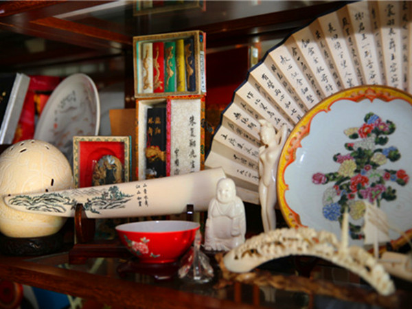 橱柜里摆满了和中华文化有关的纪念品。