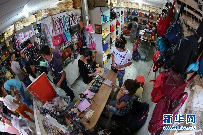 8月20日,在吉尔吉斯斯坦首都比什凯克的中海市场,多年经营箱包商铺的中国商人郑婉君正在接听客户打来的订货电话。新华社发(罗曼摄)