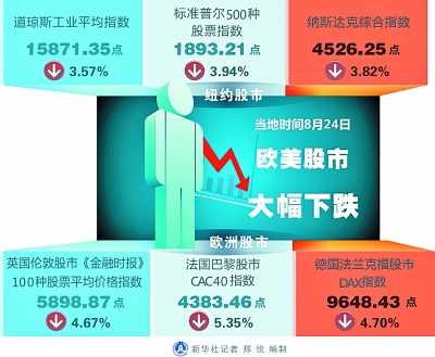 美国当地时间8月24日,美国股市遭遇“黑色星期一”,美国纽交所早盘三大股指全线狂泻,曾触发“熔断机制”,一度暂停交易。美股全天出现罕见的过山车式大幅震荡,截至当天收盘,道琼斯工业平均指数报收于15871.35点,下跌了588.4点,跌幅3.57%;标准普尔500指数报收于1893.21点,下跌77.68点,跌幅3.94%;纳斯达克综合指数报收于4526.25点,下跌179.79点,跌幅3.82%。而美油大跌5.5%,布油重跌6.1%,投资者纷纷涌向美国国债避险。