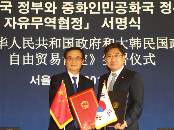 图为2015年6月1日,在韩国首尔,中国商务部部长高虎城(左)和韩国产业通商资源部长官尹相直在自贸协定签署仪式上合影。 新华社发