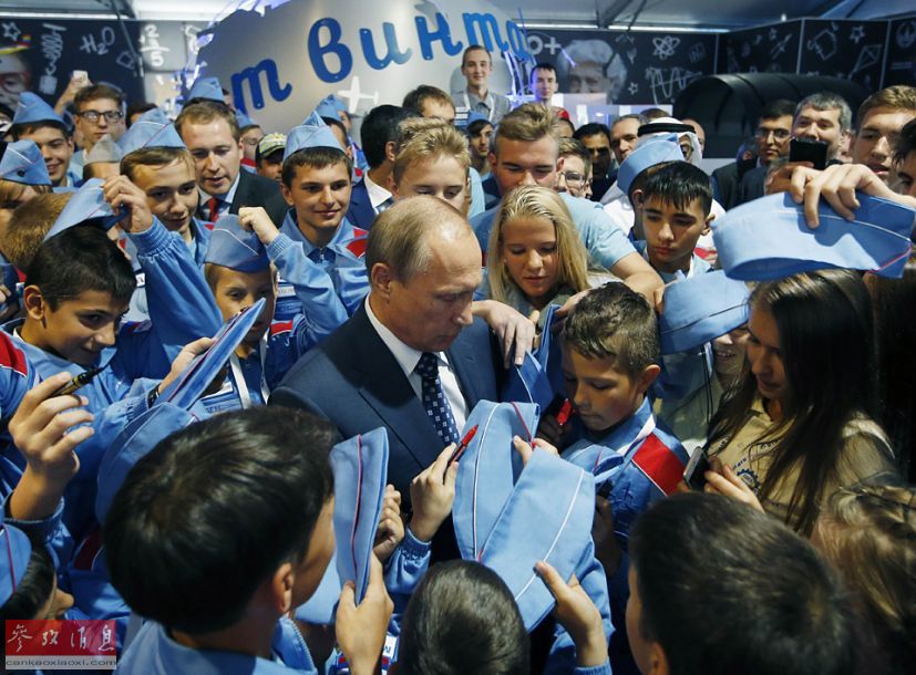 原标题:普京参加航展开幕式 遭小朋友“围攻”要签名