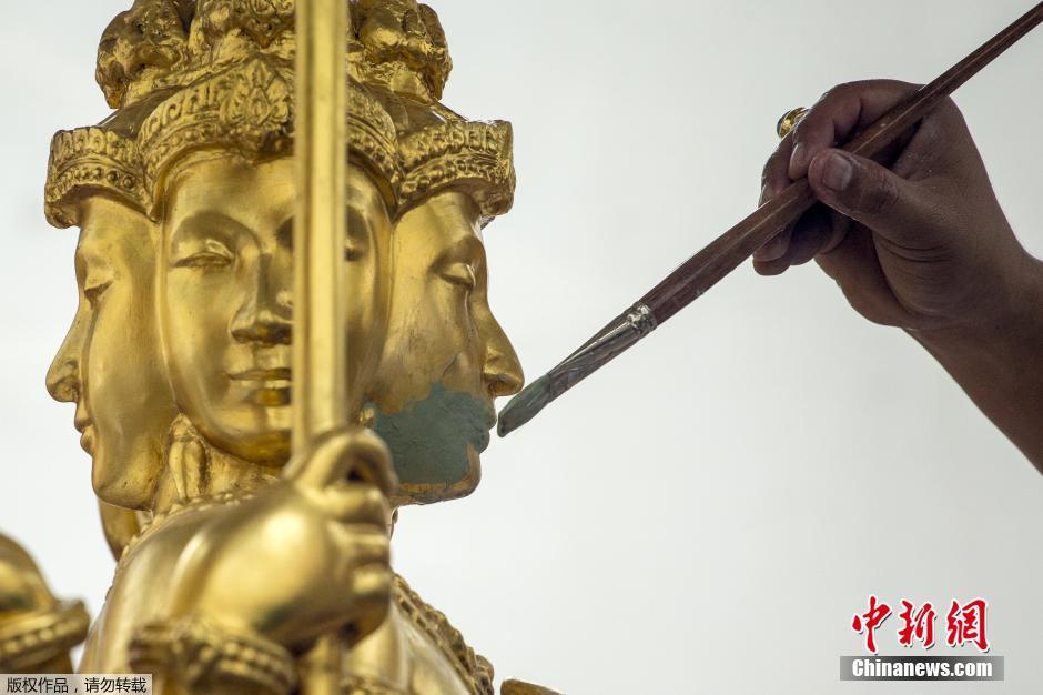 当地时间8月26日,泰国曼谷,工匠修复在曼谷爆炸案中遭损坏的四面佛像。