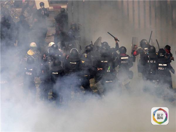 图为2013年12月26日,在泰国首都曼谷,防暴警察与反政府示威者发生冲突,导致包括媒体记者在内的多人受伤