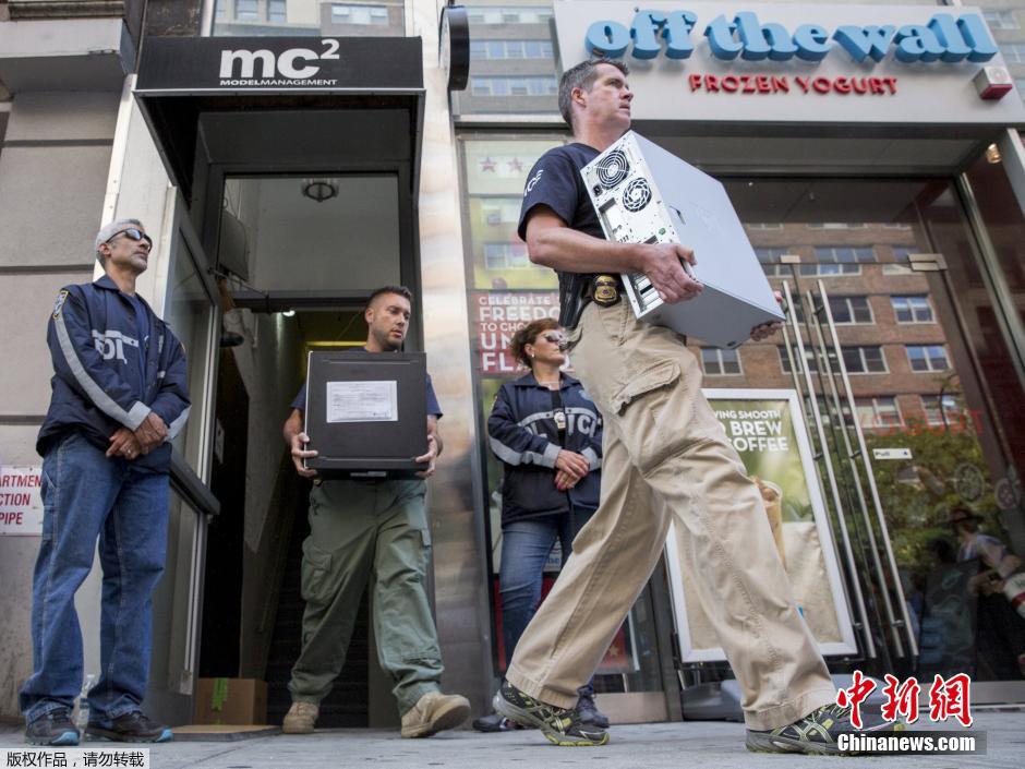 当地时间2015年8月25日,美国纽约,执法人员带走大量资料和电脑机箱。联邦执法人员宣布突袭搜查了全球最大规模男妓网站“租借男孩”(RentBoy.com)的总部,并带走了CEO和六名高层员工。这是联邦执法机构清查洗钱和卖淫问题行动的一部分。