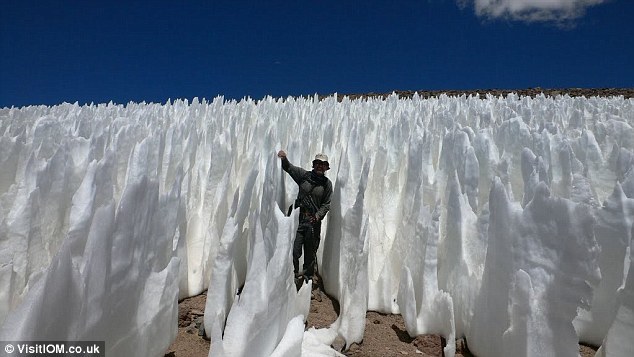 在气候恶劣的高纬度地区,阳光照射在积雪表面上,随机留下了凹陷痕,没有凹陷的地方对阳光反射作用更强不易融化,而有凹陷的地方则会加速融化,久而久之形成了冰钉奇观。