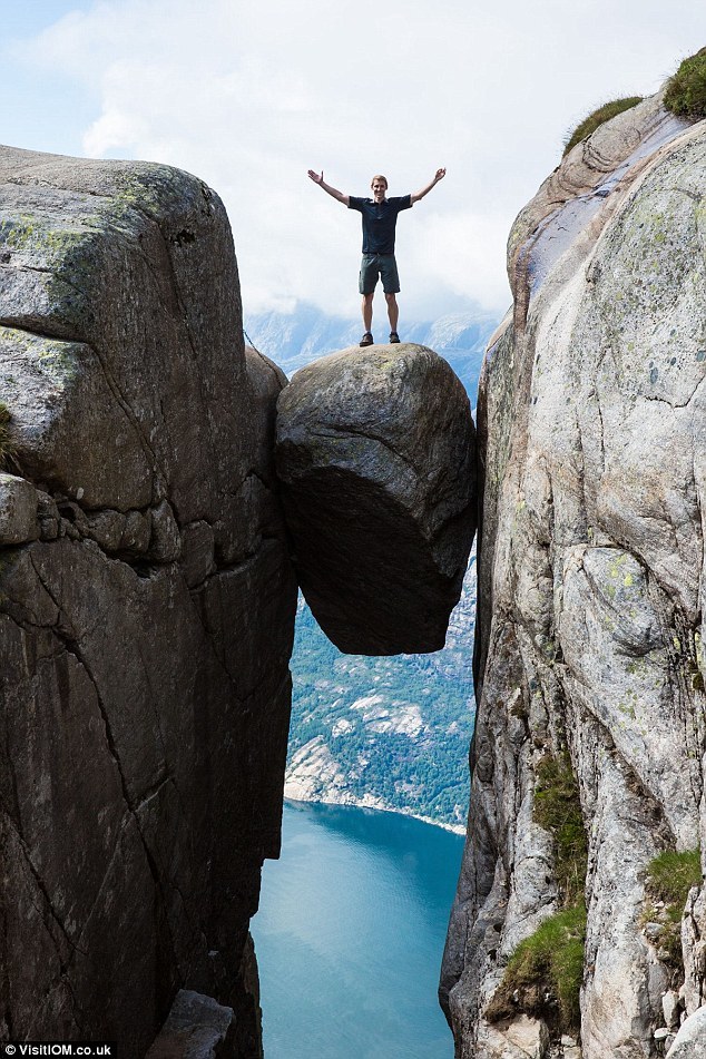 由于岩层移动,挪威的奇迹之石像楔子一样稳稳地卡在两座山之间。
