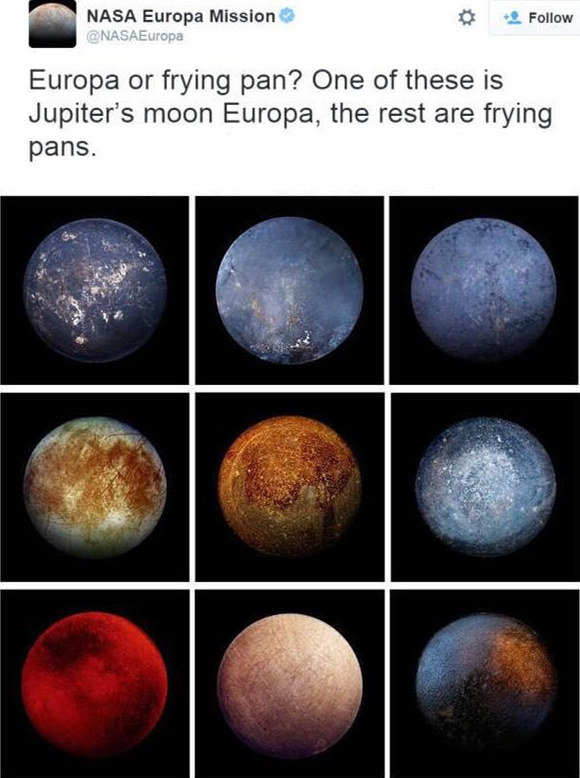 新华网北京8月27日电 据新华社“新华国际”客户端报道,宇宙、行星、卫星...普通人觉得这些都好“高冷”哦。而美国航天局(NASA)在推特上发布的一组九宫格图片却瞬间让遥远天体接了地气:“是木卫二(欧罗巴)还是平底锅?下图中有一个是木星的卫星欧罗巴,其他的都是平底锅”。