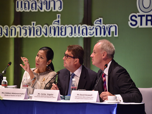 图为8月26日,在泰国曼谷,泰国旅游和体育部长科甘·瓦他那朗恭(左)、世界旅游组织国际关系执行董事卡洛斯·沃格乐(中)和世界旅游业理事会总裁兼首席执行官戴维·斯克斯尔在一场关于曼谷爆炸后泰国旅游业的新闻发布会上讨论。