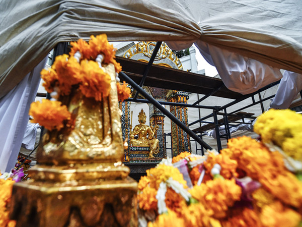 图为8月26日在泰国曼谷拍摄的修复中的四面佛神像(部分)。