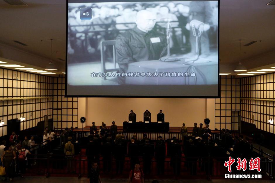 8月27日,展厅内播放的当年新闻电影制片厂现场拍摄的审判纪录片。抗战胜利70周年纪念日到来在即,中国(沈阳)审判日本战犯特别军事法庭旧址陈列馆内迎来民众参观热潮。1956年6月9日,最高人民法院特别军事法庭在此正式开庭,对包括日本前陆军中将师团长铃木启久、伪满洲国国务院总务长官武部六藏在内的36名战犯进行审判。据了解,陈列馆内的整个展区面积达到1100多平方米,重点展示日本投降后到被审判,直至当年战犯被人民政府从“鬼”改造成“人”,回国后组建“中国归还者联络会”的历史主线。历史陈列主要以文字、图表、照片、史料、文物、音像、多媒体演示等展览形式,全面反映这次正义的审判。 中新社发 李慧思 摄