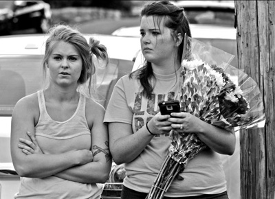 图为当地时间8月26日,在美国弗吉尼亚州罗阿诺克,人们手持鲜花悼念被枪杀的两名记者。新华社发