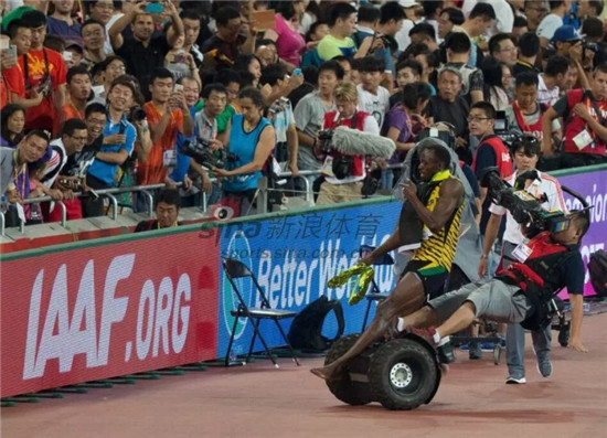 当时博尔特身披国旗绕场一周,直播机位在一直在追拍他,见过世面的摄像大哥似乎也被博尔特的光环照得睁不开眼,一时没有控制好脚下的直播车,不慎跌倒,不仅摄像机掉在了底地上,飞人博尔特也被撞翻了一个跟头,好在并无大碍。