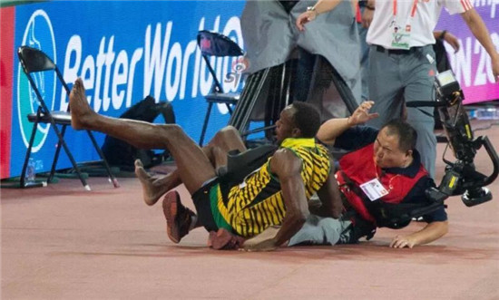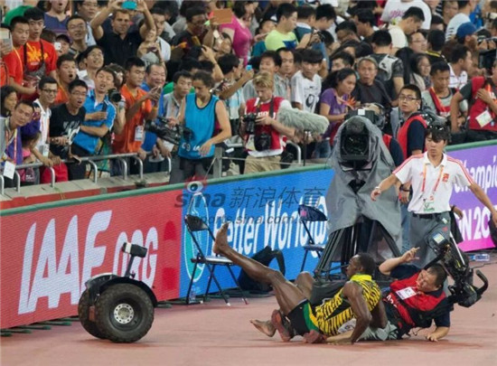 北京时间8月27日,2015年北京世界田径锦标赛继续进行。在举世瞩目的男子200米决赛中,博尔特以19秒55成功卫冕再次击败加特林。然而比赛结束后,博尔特却发生了意外,跟踪拍摄博尔特的摄像大哥一个没刹住,将牙买加闪电当场撞翻。