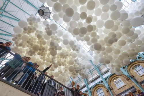 据悉,这个名为“心跳”(Heartbeat)的艺术品长54米,宽12米,悬垂于被列为二级历史建筑的室内市集南厅,事先由一支25人的团队花了5晚,为10万个气球充气。这一气球奇观将展出1个月。