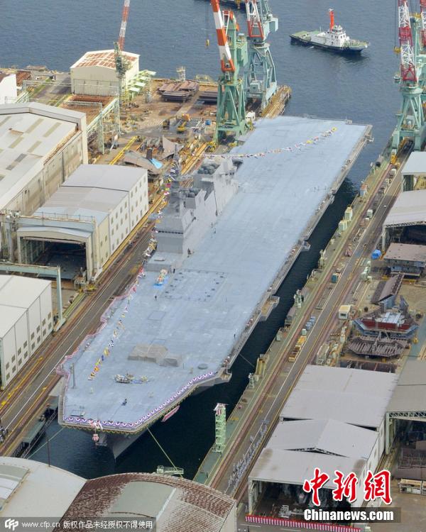 当地时间2015年8月27日,日本横滨,航拍日本海上自卫队最新型准航母DDH-184舰。日本海上自卫队最新型准航母DDH-184舰在横滨船厂正式下水。该舰被命名为“加贺”号。在二战期间,日本曾有一艘名为“加贺”号的航空母舰参与过入侵上海的1932年“一二八事变”等侵华战事。