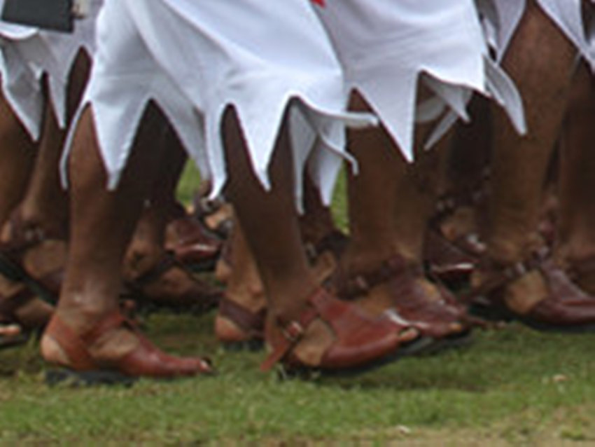 斐济7人礼服仪仗队最引人注目的地方恐怕就是他们的服装了,斐济军队常服和作训服同外军大同小异,但礼服则完全走传统斐济路线。红上衣、白苏鲁(SULU)尖角裙和皮凉鞋是斐军仪仗队“标配”。