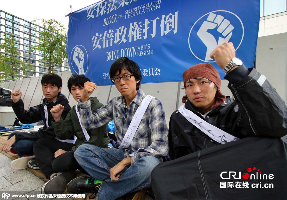 当地时间2015年8月28日,日本东京,日本大学生在日本国会议事堂前绝食,抗议安倍政府的新安保法。图片来源:CFP