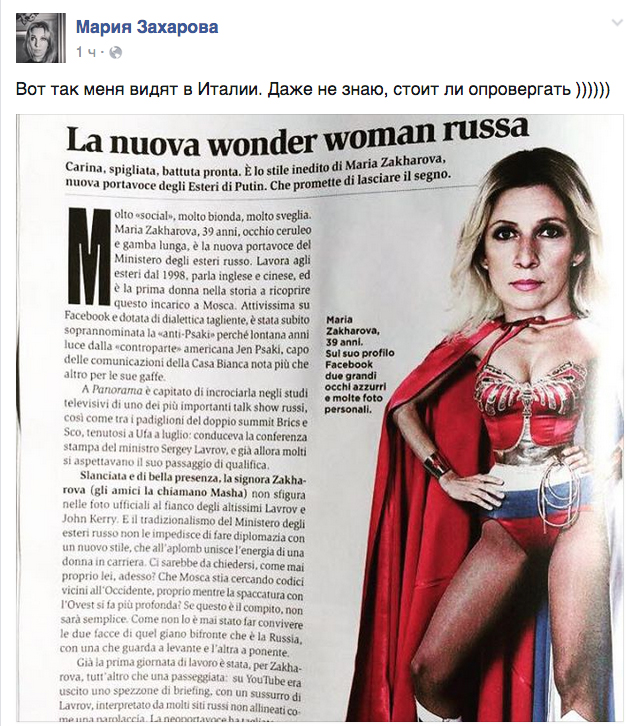 新华国际客户端了解到,扎哈罗娃自己在“脸书”个人主页上发布了这个消息。她上传了意大利一家杂志所刊登文章的图片,并写道,“在意大利是这么看我的。我都不知道,该不该去辩驳什么。”