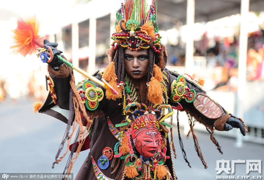 当地时间2015年8月28日,印尼任抹县,第14届任抹时尚嘉年华游行活动持续。任抹时尚嘉年华据称是世界上最大的狂欢节之一,节日期间超过千名表演者在长达3.6公里的道路上走猫步游行。