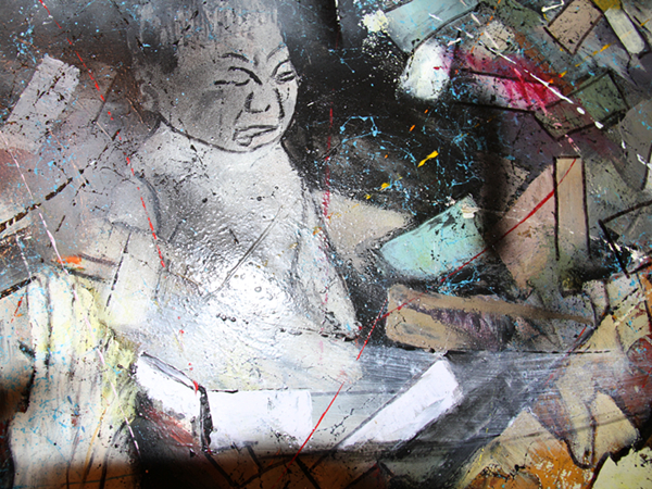 他说,这幅作品完全不是他的风格,他崇尚形象艺术和抽象艺术的完美结合,对形象表达更是游刃有余,但在这幅作品中,有许多历史场景,无论他怎样努力,也无法表达,如日本侵略者将婴儿挑在刺刀尖上,他们剖开孕妇的肚子挑出已经成形的胎儿……“我无法展现这些,太残忍了,远远超过了我的心理承受”。