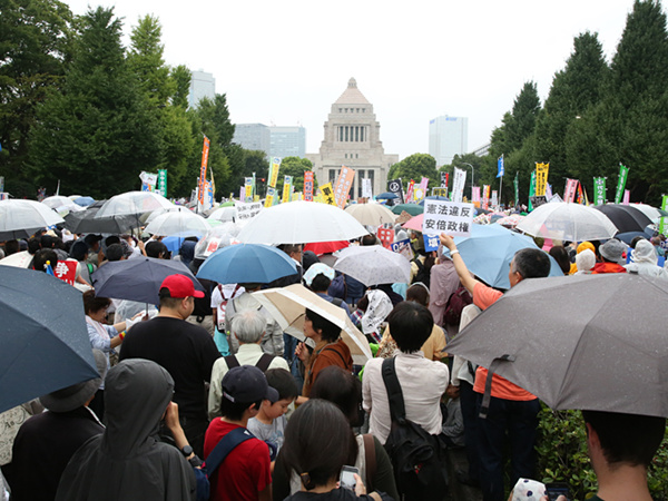 集会开始前一小时,国会大厦前已经人山人海。由日本各地男女老少组成的抗议人潮不断从四面八方涌来,国会前人行道、车道以及附近公园被抗议者围得水泄不通,一些地方甚至出现抗议者和警方冲突的场面。据主办方统计,共有12万人参加了国会大厦前的抗议集会。
