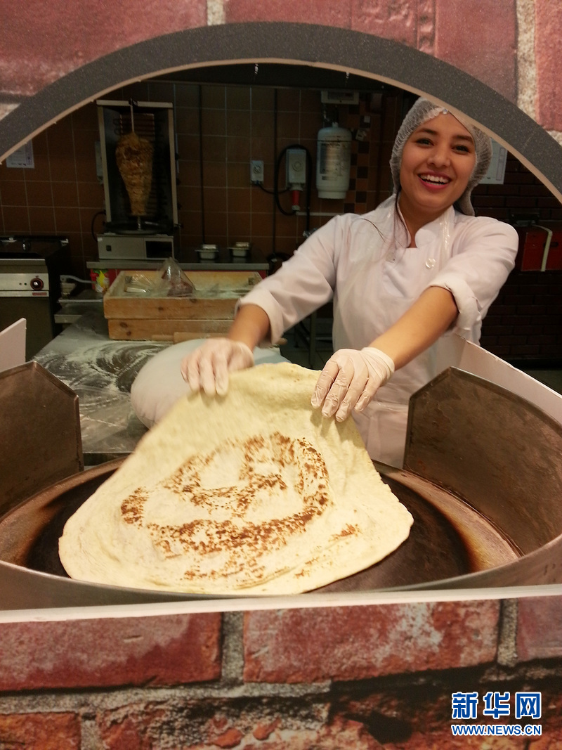 阿布扎比一超市面点房女面点师制作“沙拉卡”大饼的基本过程。新华社记者安江 摄