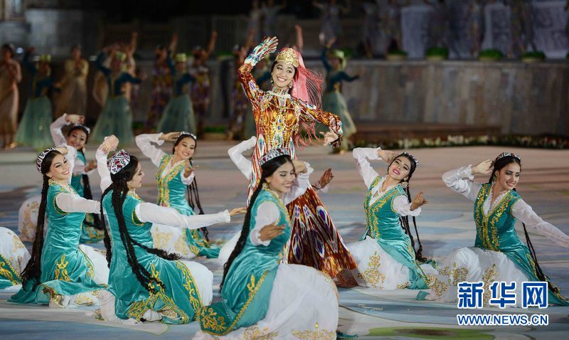 8月28日晚,演员在在乌兹别克斯坦第二大城市撒马尔罕列吉斯坦广场建筑群的第十届“东方旋律”国际音乐节上表演。新华社记者沙达提摄