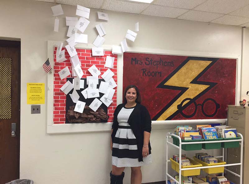 女教师Stephanie站在自己布置的哈利·波特主题教室内。(网页截图)