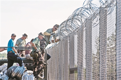 图为8月30日,在匈牙利阿绍特豪洛姆附近,匈牙利军人和工人在安装铁丝网。新华社发