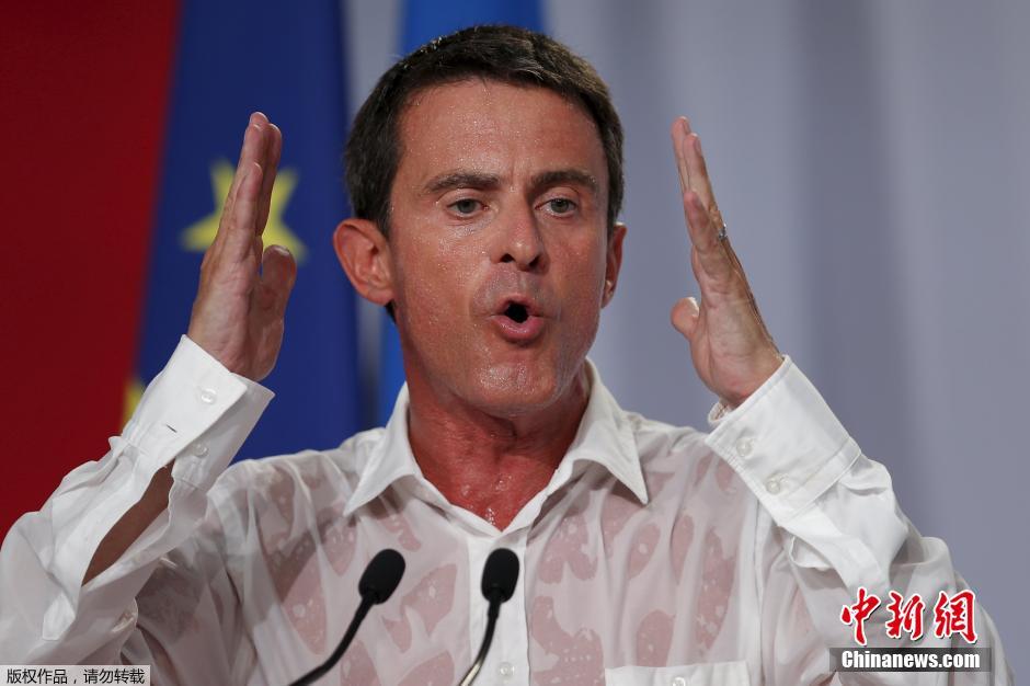 当地时间8月31日,法国拉罗谢尔,法国总理曼纽尔·瓦尔斯在社会党夏季会议闭幕日当天发表演讲,面对激烈质询,他努力解释,并控制不住的一直流汗。