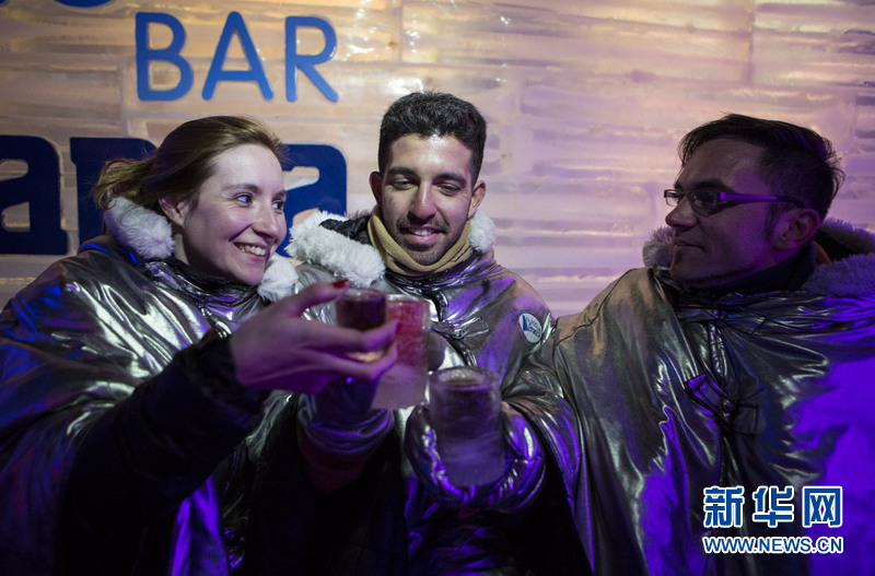 8月31日,阿根廷南部的卡拉法特市冰川博物馆,游客们在一间用莫雷诺冰川浮冰构建的“冰川酒吧”里小酌。佩尼托·莫雷诺冰川,是世界三大仍在向前推进的活冰川之一。宽5公里、高70多米的冰墙推进到阿根廷湖时逐渐瓦解崩塌成为浮冰,建筑工人把取自阿根廷湖中的大块浮冰切割成冰砖,再砌成冰墙,酒吧的吧台、酒柜、“壁炉”等都是由整块浮冰雕刻而成。新华社发(马丁·萨巴拉摄)