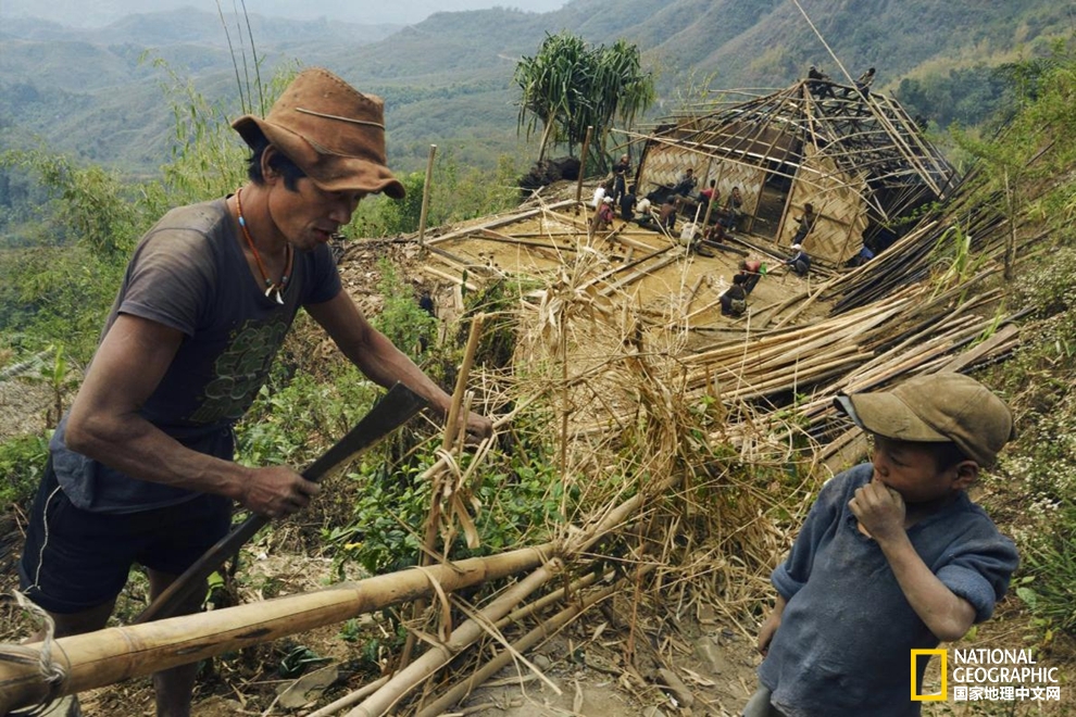 当年轻的勇士们绕着村子游行、挥舞着猎取的人头时,妇女们为他们送来米酒,老人为他们杀了一头水牛。随后,他们煮掉了人头上的肉和头发,把头骨放在村子首领屋子外的一块平板石上。Longwa是一个被印度——缅甸边境一分为二的山顶村庄。图为印度一方的村民帮助位于缅甸的一个家庭建造新房子,所用的建筑材料为竹子和茅草。