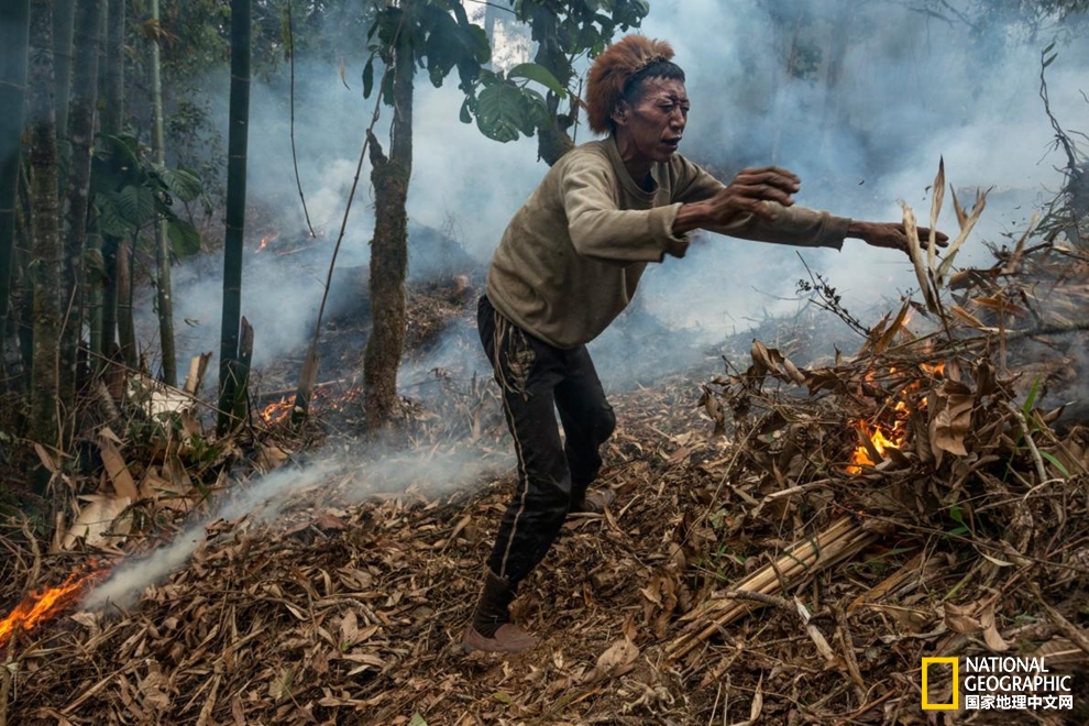 当地的一位农民使用传统的刀耕火种方法开垦土地,种植新引进的作物小豆蔻。