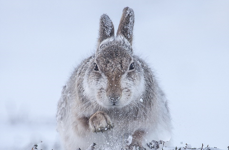 罗莎蒙德·麦克法兰(Rosamund Macfarlane)的一个摄影理想就是在雪中拍摄到苏格兰山区野兔。这种野兔原产于英国,它们会根据气温高低,将毛色蜕变成褐色、白色或部分白色。在当地专家帮助下,麦克法兰爬进苏格兰的一个山谷中。那里当时有及膝深的雪,并幸运地遇到了2只野兔,近距离拍摄到它们的照片。
