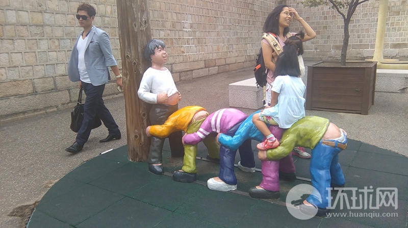 韩国首尔市政厅在8月26日-29日期间组织了包括中国大陆、香港、台湾地区以及新加坡和马来西亚的多家媒体到首尔进行考察。图为韩国国立民俗博物馆外的韩国传统游戏雕塑,一个妈妈带着孩子在此处游玩。