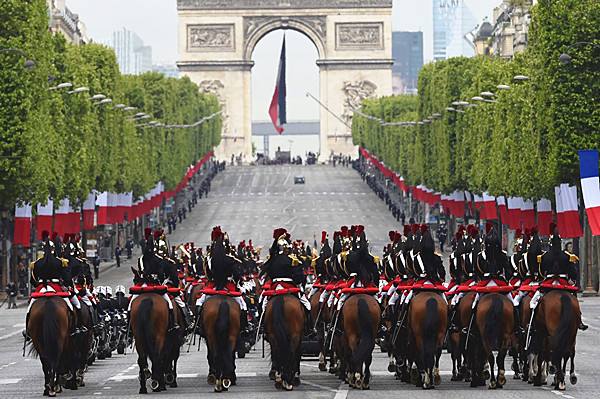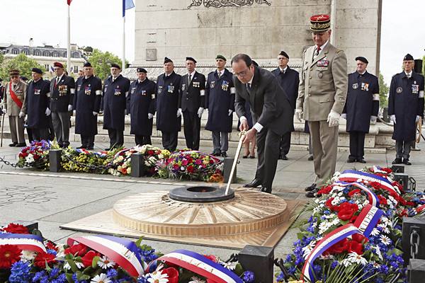 奥朗德检阅了军队,向凯旋门下的无名战士墓敬献花环并默哀,并为无名战士墓前的“纪念之火”添火、拨旺火焰。(新华社/法新)
