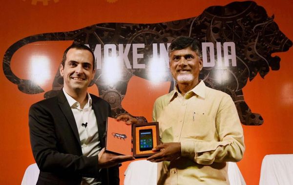 小米公司国际副总裁雨果·巴拉(左)和印度安得拉邦首席部长纳拉·钱德拉巴布·奈杜,8月在维瑟克伯德讷姆举行的发布会上宣布小米手机落户印度。(美国雅虎新闻网站)
