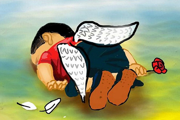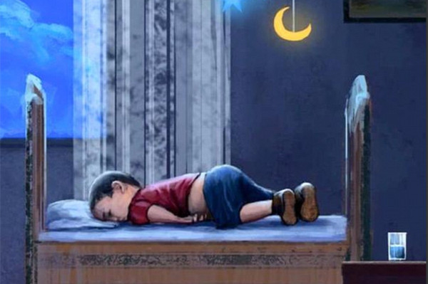 网民们基于这张令人心酸的照片,创作出许多凄美的图片,表达对这个名为艾兰·库尔迪的3岁叙利亚小难民的哀思。