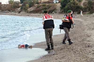 9月2日,博德鲁姆,土耳其宪兵站在难民儿童尸体旁。
