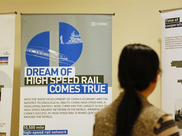 图为“高铁梦之旅”活动参加者在“中美铁路150年图片展”展板前驻足观看。