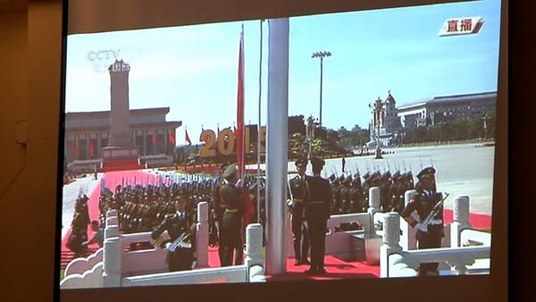 当礼炮响起,观看直播现场的全体人员起立,注目国旗徐徐升起,伴随着庄严嘹亮的《义勇军进行曲》,高唱国歌。随后人们认真聆听中国国家主席习近平的讲话,并对习主席的一席话报以热烈的掌声。