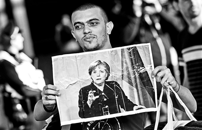 一位抵达慕尼黑火车站的难民手持德国总理默克尔照片 供图/IC